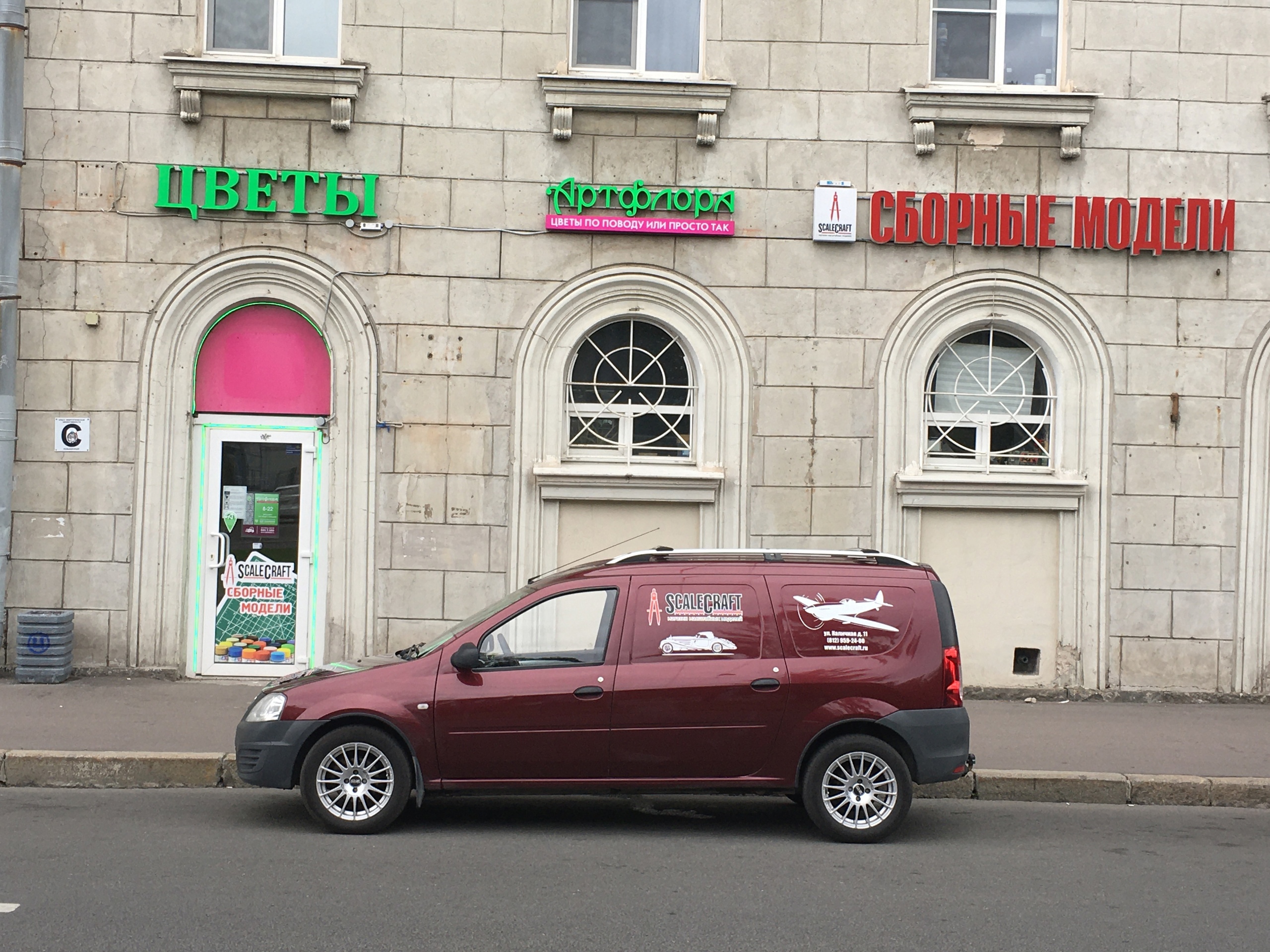 Магазин расположен по адресу: 199026, Санкт-Петербург, Наличная улица, 11. Вход с улицы, вывеска «Сборные модели», общий вход с магазином цветов.